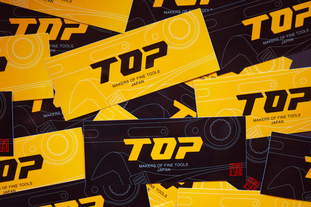 TOP ステッカー Goods / Graphic / Client:トップ工業株式会社 新潟県三条市の作業工具メーカーであるトップ工業様のステッカーをデザインさせていただきました。トップ工業様の品質への絶対の自信の表現として、主力製品であるモンキーレンチとラチェットレンチをストレートに線画で配置したデザインです。